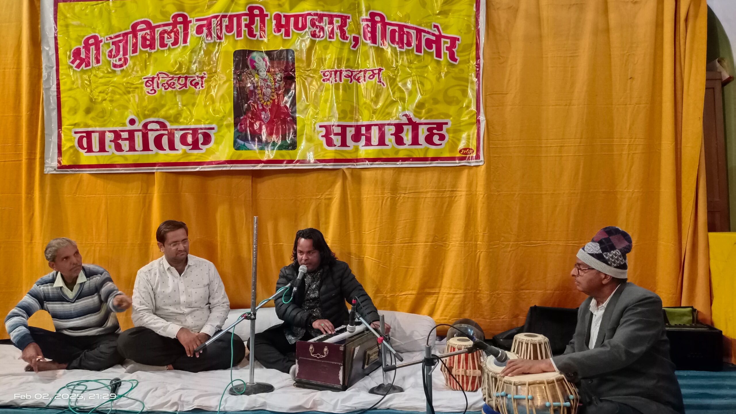 हारमोनियम पर वरिष्ठ संगीतज्ञ पुखराज शर्मा एवं तबले पर संगत सांस्कृतिक संध्या के संयोजक अहमद बशीर सिसोदिया ने दी।