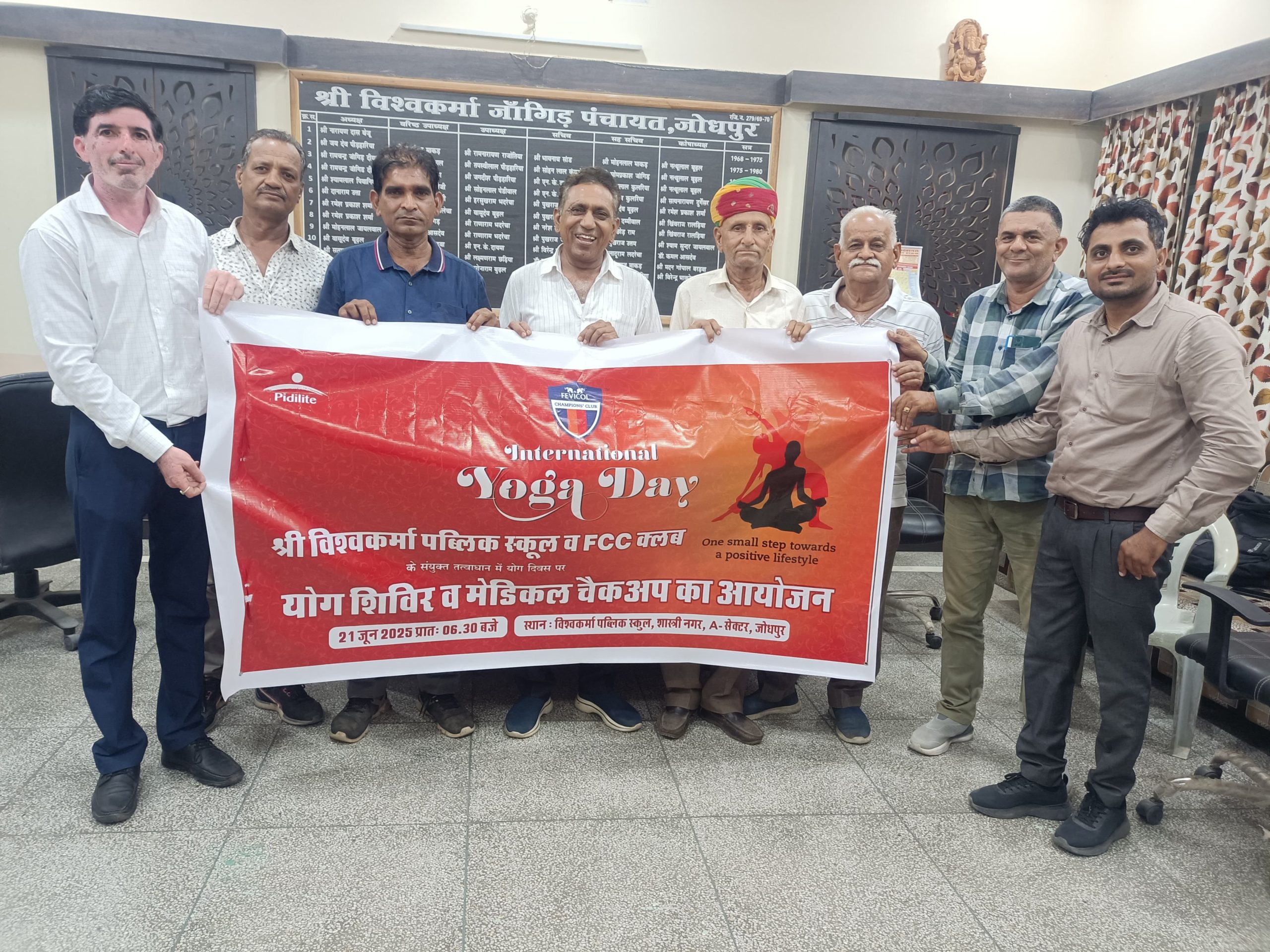 हर वर्ष की भांति 21 जून को विश्व स्तर पर अंतरराष्ट्रीय योग दिवस का आयोजन होगा। इसी क्रम में हर वर्ष की भांति फेविकोल चैंपियंस क्लब (जोधपुर) द्वारा शास्त्री नगर स्थित विश्वकर्मा पब्लिक सैकेंडरी स्कूल में योग गुरु राधेश्याम विद्यालंकार के सानिध्य में प्रातः 6.30 बजे अंतराष्ट्रीय योग दिवस मनाया जाएगा। साथ ही चिकित्सा शिविर भी लगाया जाएगा, जिसके बैनर का आज शास्त्री नगर स्थित श्री पंचायत भवन कार्यालय में श्री पंचायत के अध्यक्ष वासुदेव बुढ़ल, वरिष्ठ उपाध्यक्ष ज्योति स्वरूप धनेरवा, उपाध्यक्ष सोनाराम बुढ़ल, कोषाध्यक्ष वीरेंद्र भाकरेचा, डी.पी. शर्मा, हुकमाराम झिलोया सहित गणमान्य लोगों द्वारा विमोचन किया गया।