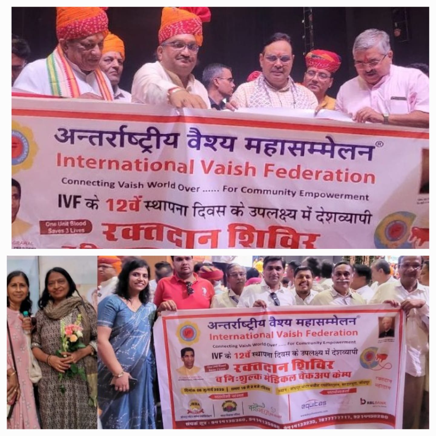अन्तर्राष्ट्रीय वैश्य फेडरेशन के 12वें स्थापना दिवस के अवसर पर आगामी 6 जुलाई 2025, रविवार को विशाल रक्तदान शिविर एवं निःशुल्क स्वास्थ्य जाँच शिविर का आयोजन किया जायेगा। गुरुवार को मारवाड कन्वेंशनल सेन्टर में राजस्थान के मुख्यमंत्री भजन लाल शर्मा द्वारा रक्तदान शिविर के बैनर का विमोचन किया गया और वैश्य फेडरेशन द्वारा की जा रही समाजोपयोगी गतिविधियों की जानकारी प्रदान की गई; जिसकी मुख्यमन्त्री द्वारा सराहना की गई। विमोचन कार्यक्रम में शहर विधायक अतुल भंसाली, सुरसागर विधायक देवेन्द्र जोशी वैश्य फेडरेशन के जिला अध्यक्ष राजेन्द्र राठी, वरिष्ठ उपाध्यक्ष दिलीप अग्रवाल, महामन्त्री आनन्द प्रकाश गुप्ता, कोषाध्यक्ष विवेक सिंघवी, महिला ईकाई अध्यक्ष अनिता मेहता, सचिव सन्तोष जैसलमेरिया, कोषाध्यक्ष नलिनी बंसल, युवा ईकाई अध्यक्ष खुश सिघवी, सह सचिव दीपक गुप्ता, सुरेश मुथा, शीतल सुराणा, सुरेश भूतडा एंव वैश्य समाज के गणमान्य सदस्य उपस्थित थे। शिविर में सहयोगी संस्था के रूप में जोधपुर मोटर मर्चेन्ट एसोसियेशन, भारत विकास परिषद मुख्य शाखा, वन्दे भारत सेवा संस्थान अपना सहयोग प्रदान कर रही है।