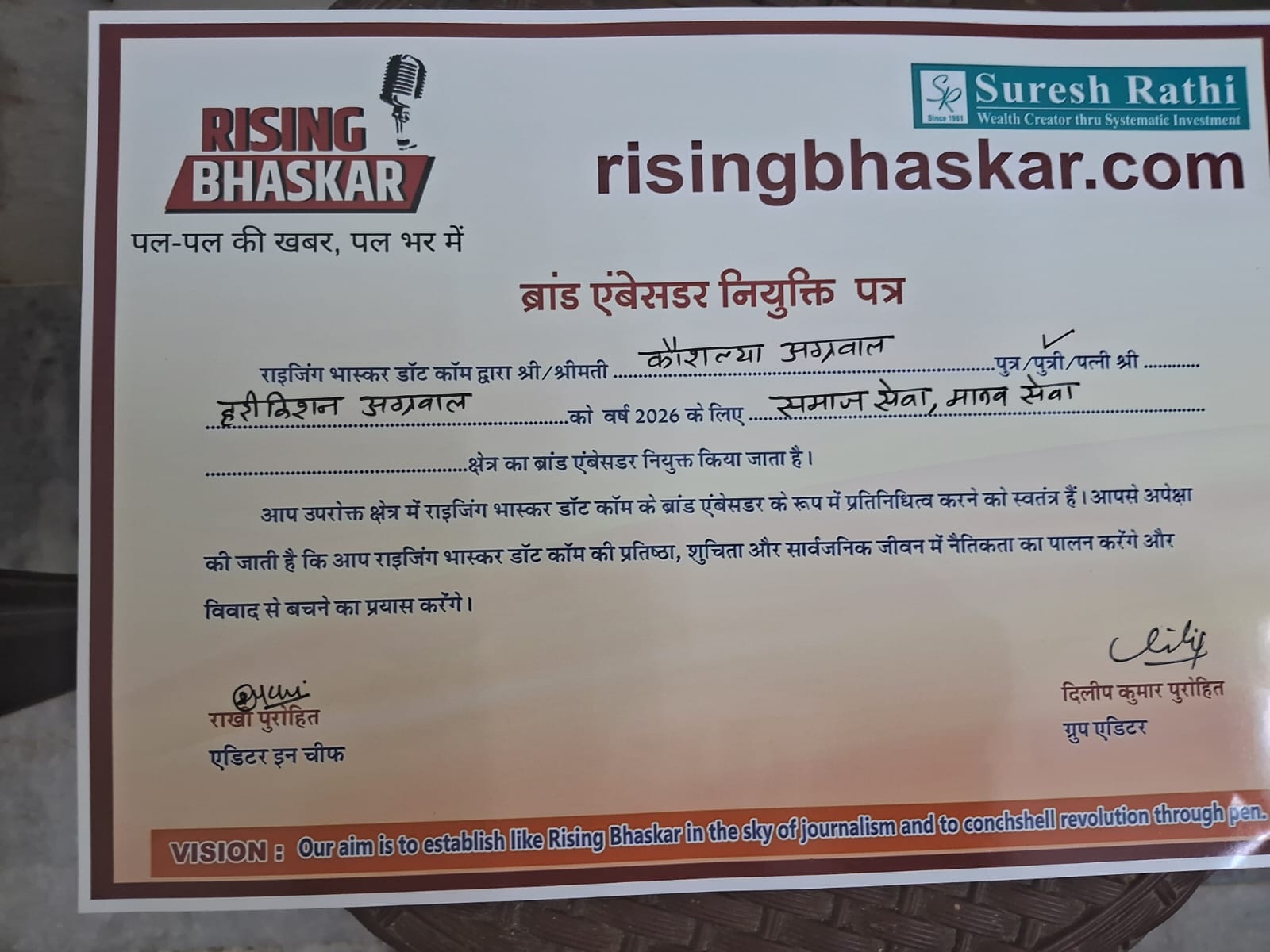 कौशल्या अग्रवाल को समाज सेवा और मानव सेवा क्षेत्र में राइजिंग भास्कर डॉट कॉम का ब्रांड एंबेसडर भी बनाया गया, उन्हें बुधवार को राइजिंग भास्कर कार्यालय में ब्रांड एंबेसडर का नियुक्ति पत्र सौंपा गया।