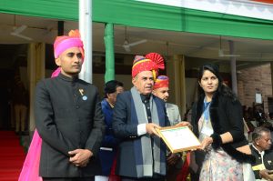 मुख्य अतिथि श्री जोगाराम पटेल ने विभिन्न क्षेत्रों में उत्कृष्ट एवं उल्लेखनीय सेवाओं के लिए 39 महानुभावों को प्रशंसा पत्र प्रदान कर सम्मानित किया। राज्यपाल का संदेश अतिरिक्त जिला कलक्टर (प्रथम) श्री जवाहर चौधरी द्वारा पढ़कर सुनाया गया।