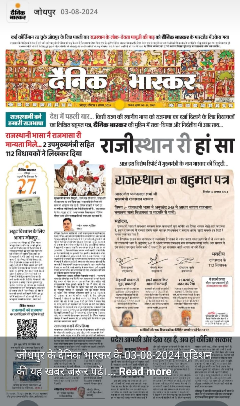 प्रधानमंत्री जी, वर्ष 2024 में दैनिक भास्कर के स्थापना दिवस पर “राजस्थान का बहुमत पत्र” शीर्षक से एक ऐतिहासिक पहल की गई थी। इस पत्र में राजस्थान के 112 विधायकों ने हस्ताक्षर कर राज्य की जनभावनाओं को स्पष्ट रूप से व्यक्त किया था कि राजस्थानी भाषा को संविधान की आठवीं अनुसूची में शामिल किया जाए। इस बहुमत पत्र पर पूर्व मुख्यमंत्री वसुंधरा राजे, पूर्व मुख्यमंत्री अशोक गहलोत, उपमुख्यमंत्री दीया कुमारी, उपमुख्यमंत्री प्रेमचंद बैरवा, तत्कालीन नेता प्रतिपक्ष टीकाराम जूली, तथा जोधपुर के पूर्व नरेश गजसिंह सहित अनेक वरिष्ठ जनप्रतिनिधियों के हस्ताक्षर शामिल थे।