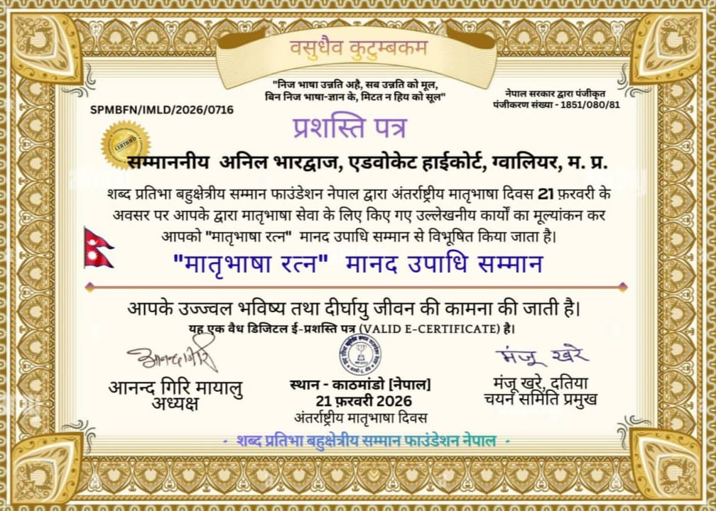 साहित्यिक सामाजिक एवं सांस्कृतिक संस्था शब्द प्रतिभा बहुक्षेत्रीय सम्मान फाउंडेशन नेपाल के तत्वावधान में अंतर्राष्ट्रीय मातृभाषा दिवस पर मातृभाषा रत्न उपाधि सम्मान 2026 से मध्य प्रदेश ग्वालियर के वरिष्ठ गीतकार व हिंदी सेवी साहित्यकार अनिल भारद्वाज एडवोकेट को सम्मानित किया गया है।