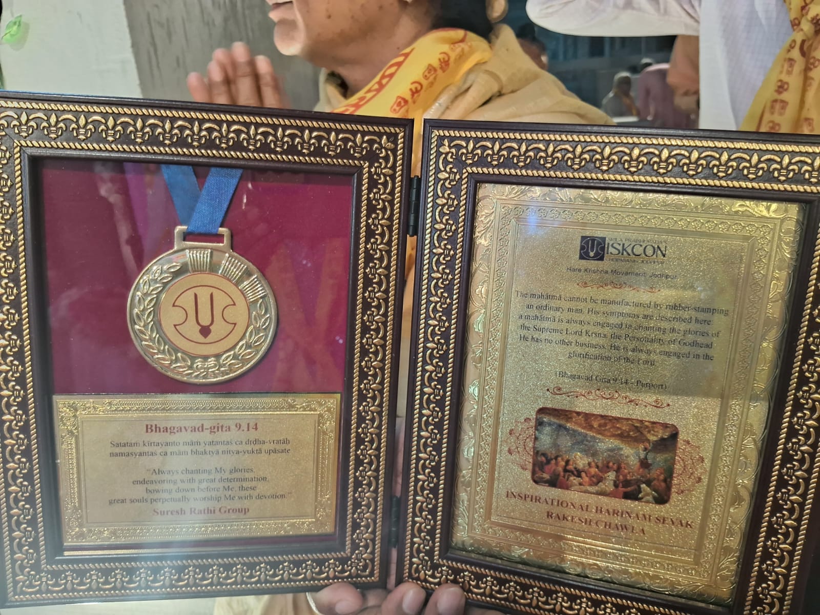 कार्यक्रम के मुख्य अतिथि सुरेश जी राठी, श्रीमती शशि जी राठी और सौरभ जी राठी का आयोजकों द्वारा सम्मान किया गया। सेवा देने वाले भक्तों को भी मंच पर बुलाकर सम्मानित किया गया। तरुण गहलोत, निखिलात्मा दास प्रभु, घनश्याम ओझा, डॉ. जेपी सोनी, डॉ. मीनाक्षी सोनी सहित शहर के अनेक प्रबुद्धजन कार्यक्रम में उपस्थित रहे। पूरे आयोजन में अनुशासन और व्यवस्था का विशेष ध्यान रखा गया।