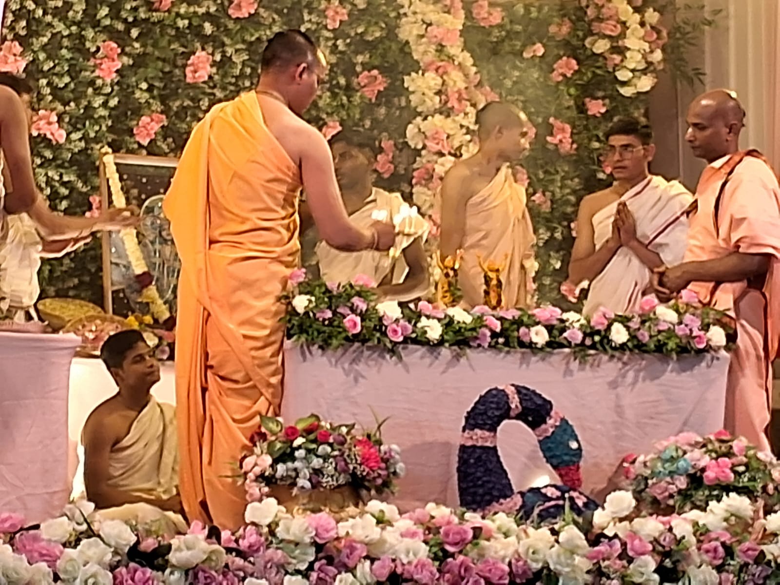 कार्यक्रम का शुभारंभ वैदिक मंत्रोच्चार के बीच पुष्प अभिषेक से हुआ। मंदिर में सुगंधित पुष्पों, चंदन, केसर और विविध सुगंधित द्रव्यों से चैतन्य महाप्रभु का अभिषेक किया गया। प्रतिमाओं को सप्त नदियों के पवित्र जल से स्नान करवाया गया। वातावरण में शंखनाद और घंटियों की ध्वनि गूंज रही थी। ऐसा प्रतीत हो रहा था मानो पूरा परिसर किसी दिव्य लोक में परिवर्तित हो गया हो।