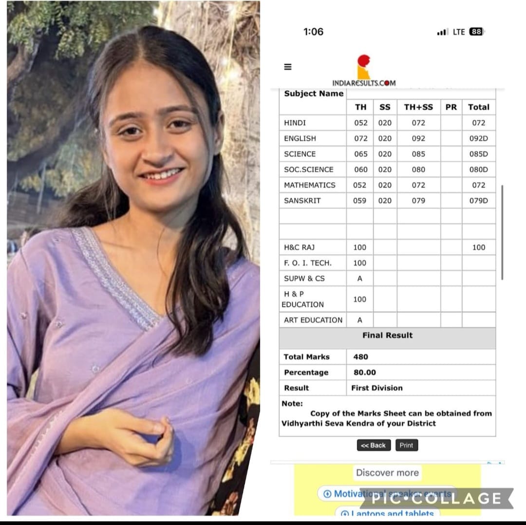 राजस्थान माध्यमिक शिक्षा बोर्ड (RBSE) की 10वीं परीक्षा में मीनाक्षी व्यास ने 80 प्रतिशत अंक प्राप्त कर उल्लेखनीय सफलता हासिल की है। इस उपलब्धि से न केवल उनके परिवार बल्कि स्कूल और पूरे क्षेत्र में खुशी और गर्व का माहौल है। मीनाक्षी की यह सफलता उनकी मेहनत, अनुशासन और सकारात्मक सोच का परिणाम है।