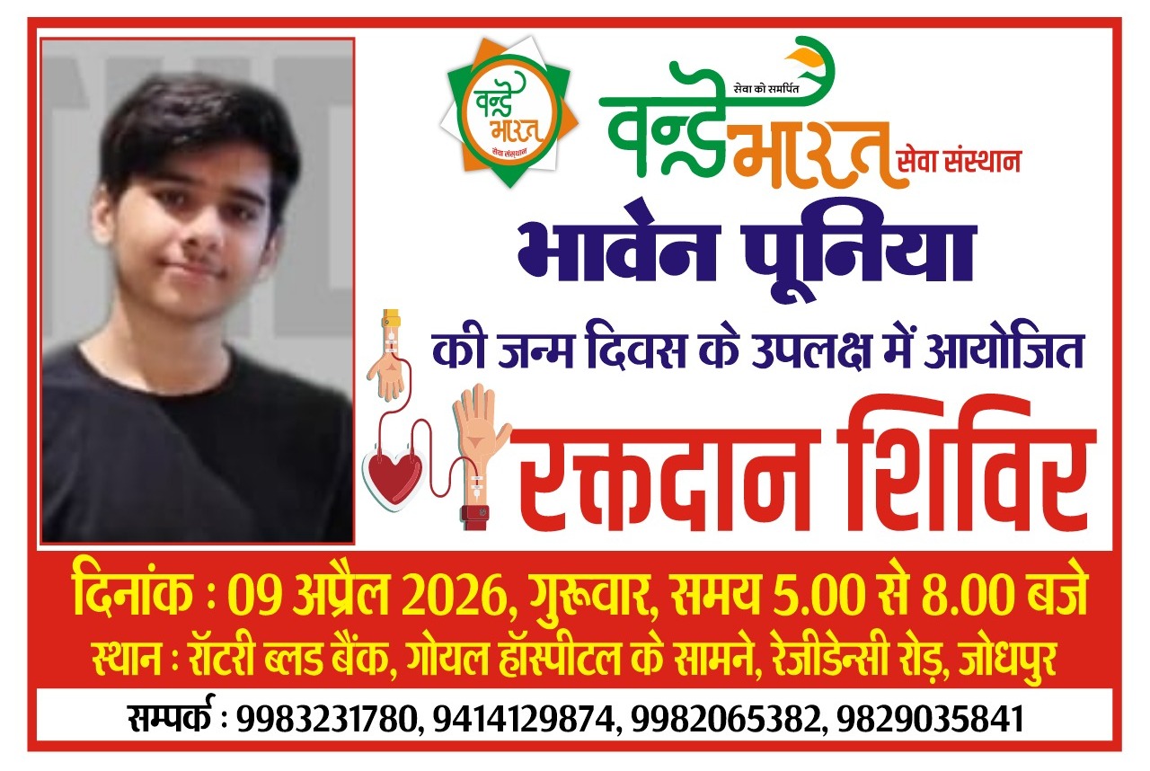 जोधपुर में समाज सेवा और मानवता के प्रति समर्पण की एक प्रेरणादायक पहल के तहत वंदे भारत सेवा संस्थान द्वारा 9 अप्रैल 2026, गुरुवार को रक्तदान शिविर का आयोजन किया जा रहा है। यह शिविर भावेन पूनिया के जन्मदिवस के उपलक्ष्य में आयोजित किया जा रहा है, जिसका उद्देश्य जरूरतमंद मरीजों को जीवनदान देने के साथ-साथ समाज में रक्तदान के प्रति जागरूकता बढ़ाना है।