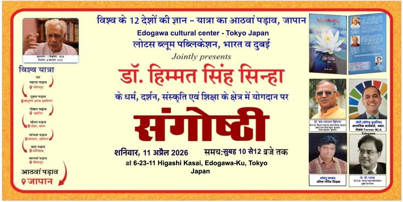 ब्रह्मलीन, युग मनीषी प्रोफ़ेसर हिम्मत सिंह सिन्हा की ज्ञान – यात्रा का नौवा पड़ाव 11 अप्रैल को टोक्यो, जापान में होना तय हुआ है। लोटस ब्लूम पब्लिकेशन के सीईओ, केबी व्यास और प्रेरणा वृद्धाश्रम कुरुक्षेत्र के संस्थापक डाॅ. जय भगवान सिंगला इस नौवें कार्यक्रम हेतु जापान पधारे हैं।