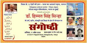 जापान में प्रोफ़ेसर सिन्हा साहब की ज्ञान यात्रा में दो कार्यक्रम होने हैं। पहला टोक्यो में 11 अप्रैल को और दूसरा ओसाका में 12 अप्रैल को होना तय हुआ है। टोक्यो का कार्यक्रम एदोगावा कल्चरल सेंटर में हो रहा है जो भारतीय मूल के योगेन्द्र पौराणिक का है और वे जापान की सक्रिय राजनीति का हिस्सा हैं तथा एदोगावा, जापान क्षेत्र के भूतपूर्व एमएलए भी रह चुके हैं ।